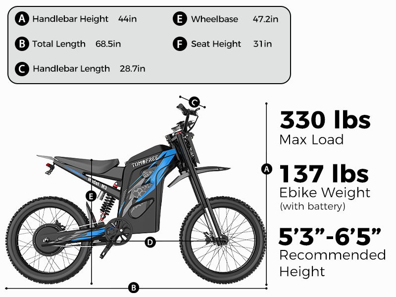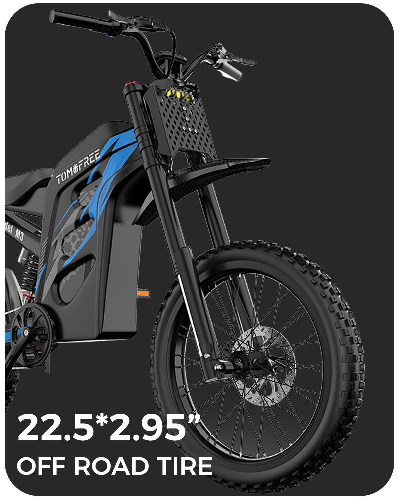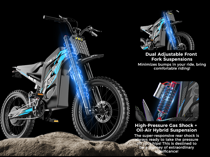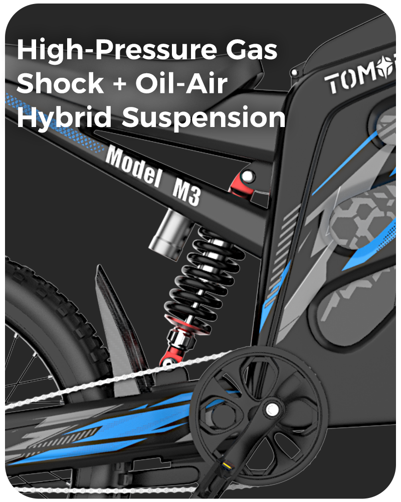 The Tomofree M3 is featuring a high-pressure gas shock combined with an oil-air hybrid system delivers 100mm of adjustable travel, absorbing impact with precision. Paired with vibration-damping handlebars, this setup reduces rider fatigue by up to 60%, allowing for longer, more comfortable rides. Whether you're powering through rocky trails, tackling technical descents, or landing high-impact jumps.