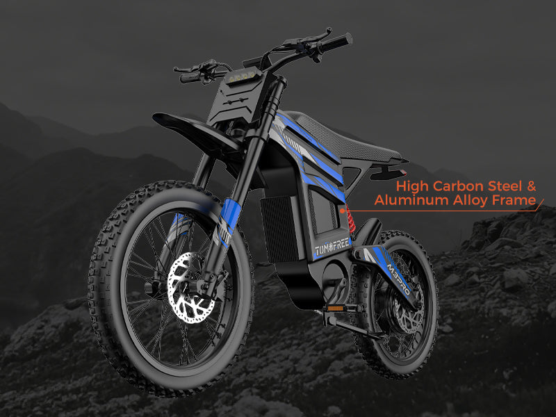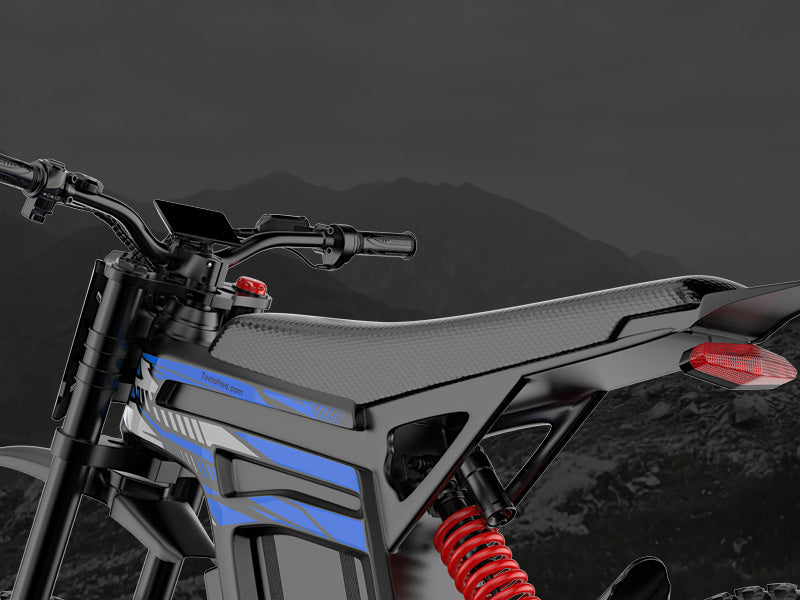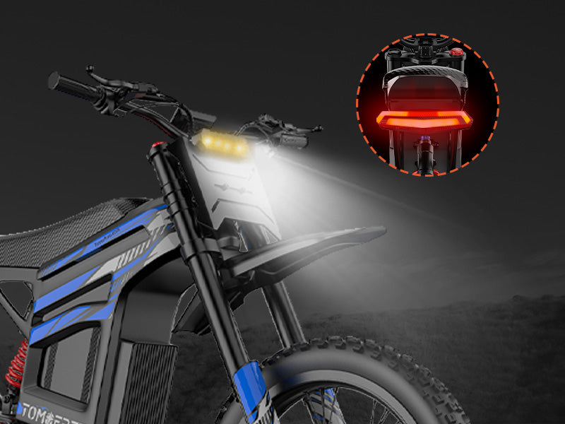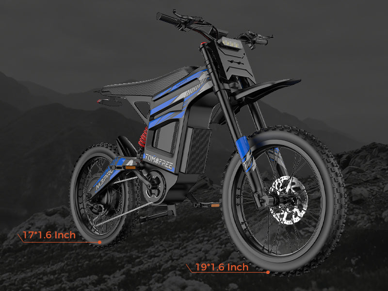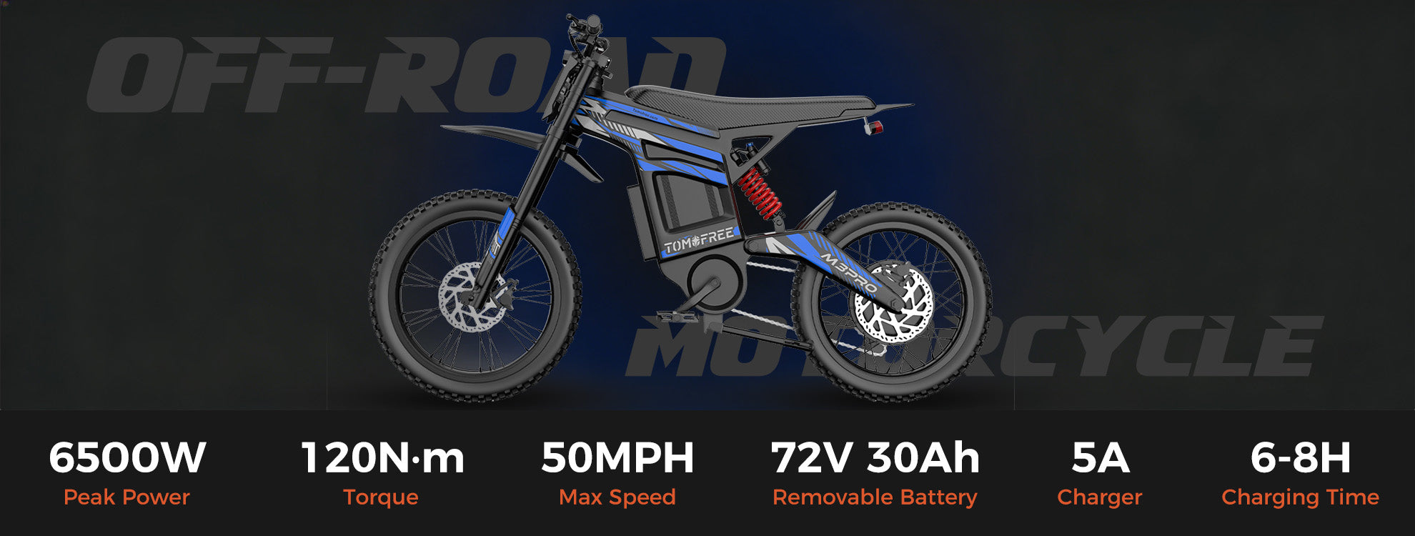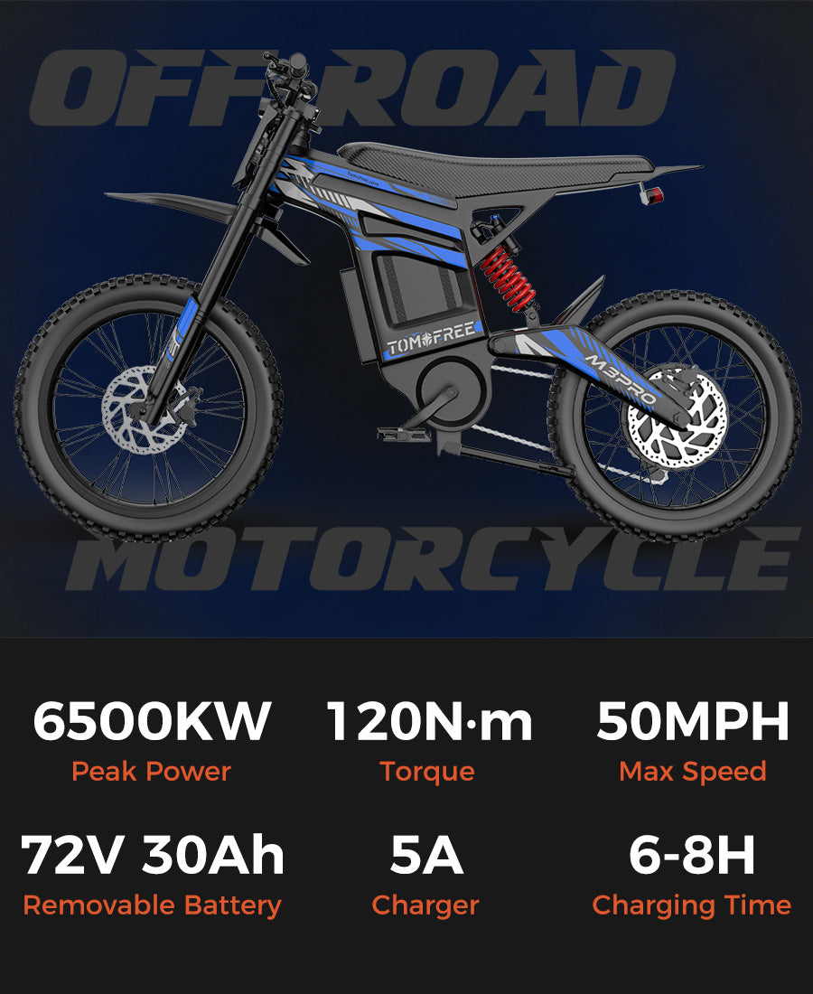 Dominate any terrain with the Tomofree M3PRO's peak 6500W brushless motor delivering strong power and a top speed of 50 MPH. Powered by a premium 72V 30Ah removable lithium-ion battery that provides up to 75 miles of real-world range and fully charges in 6–8 hours. Professional-grade features include 170mm adjustable front forks, 65mm adjustable rear suspension, dual hydraulic brakes, 19"/17" pneumatic off-road tires, high carbon steel & aluminum alloy frame, full-twist throttle, LED display, front light, tail light and rear turn signals.