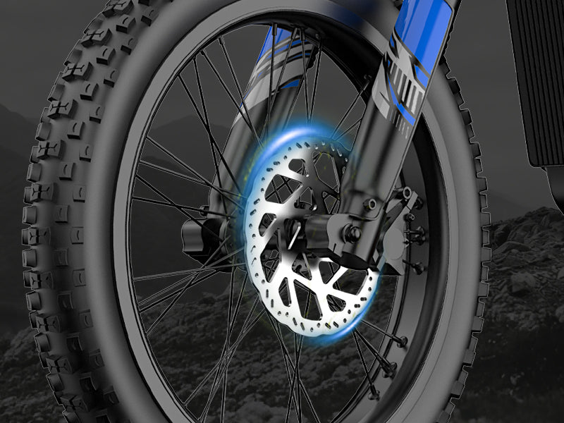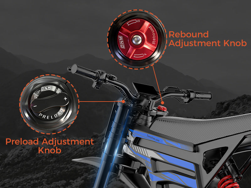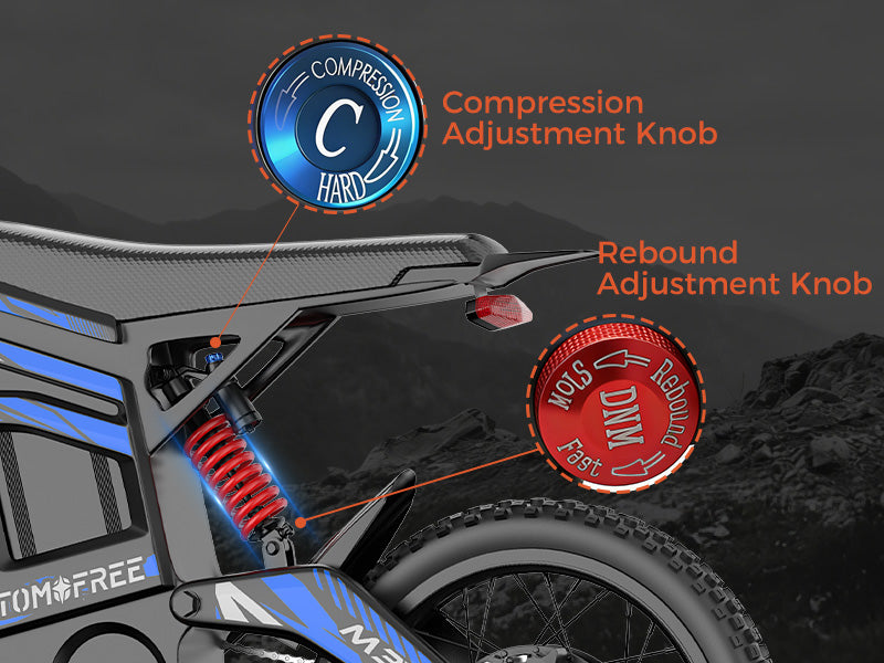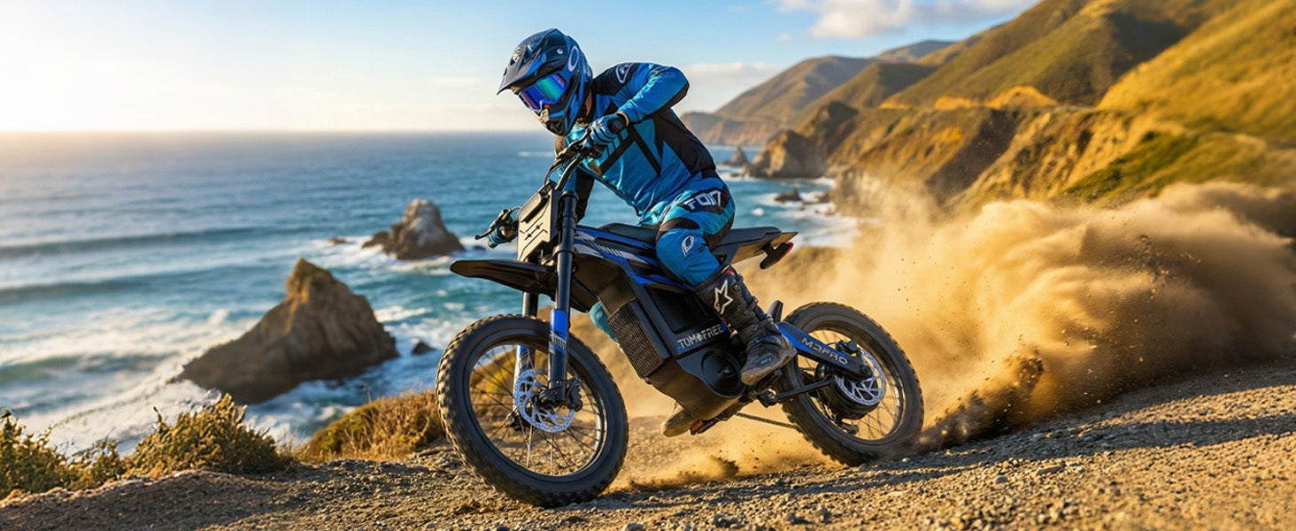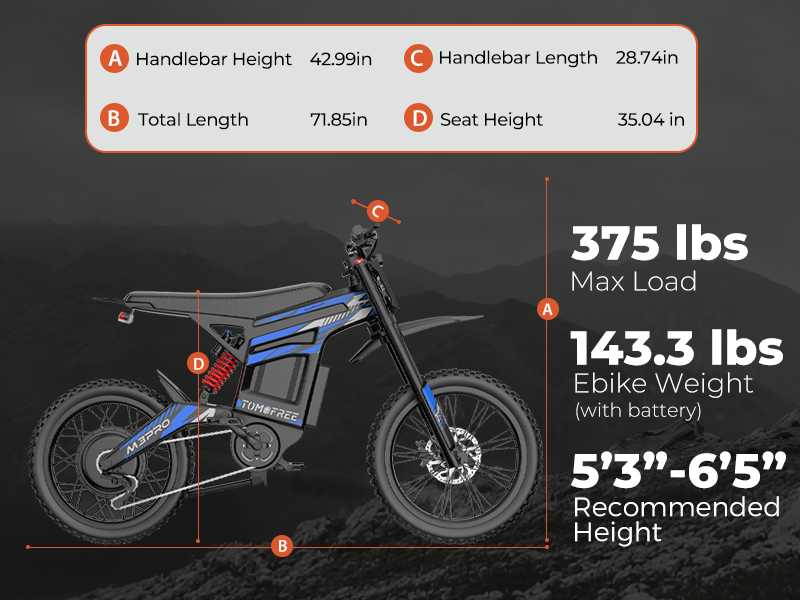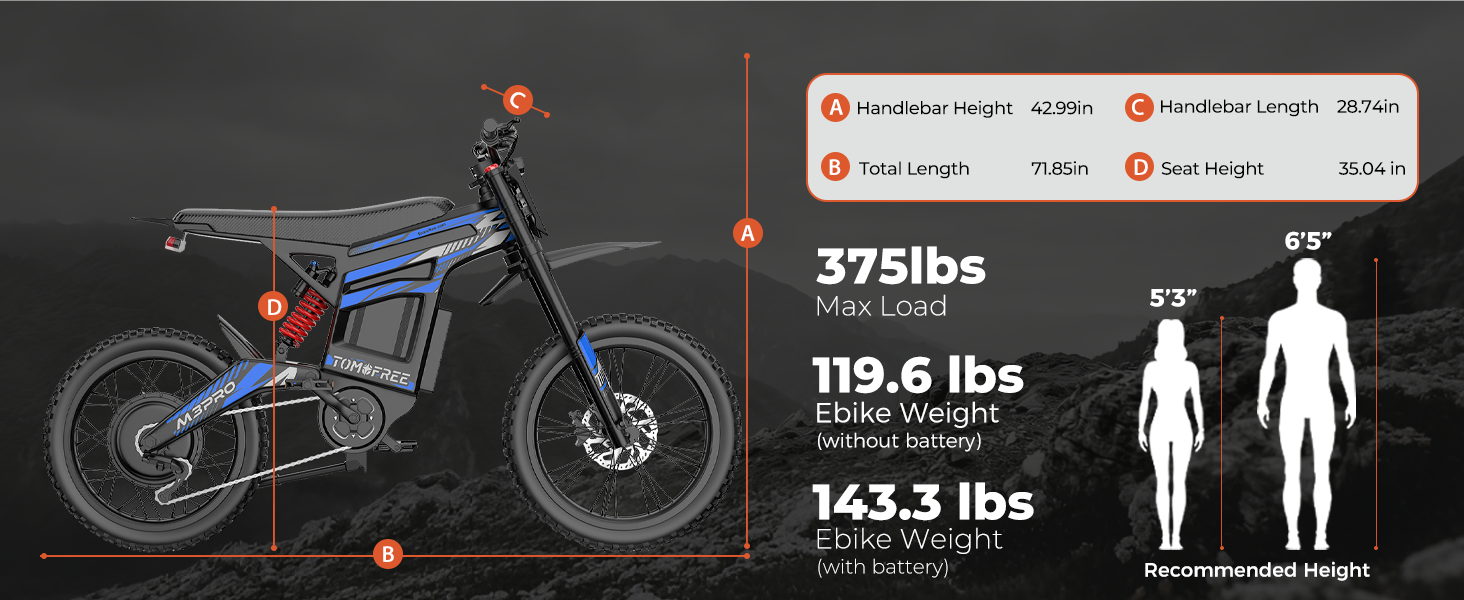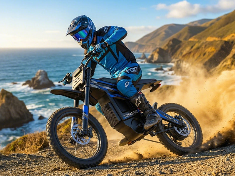 Dominate any terrain with the Tomofree M3PRO's peak 6500W brushless motor delivering strong power and a top speed of 50 MPH. Powered by a premium 72V 30Ah removable lithium-ion battery that provides up to 75 miles of real-world range and fully charges in 6–8 hours. Professional-grade features include 170mm adjustable front forks, 65mm adjustable rear suspension, dual hydraulic brakes, 19"/17" pneumatic off-road tires, high carbon steel & aluminum alloy frame, full-twist throttle, LED display, front light, tail light and rear turn signals.