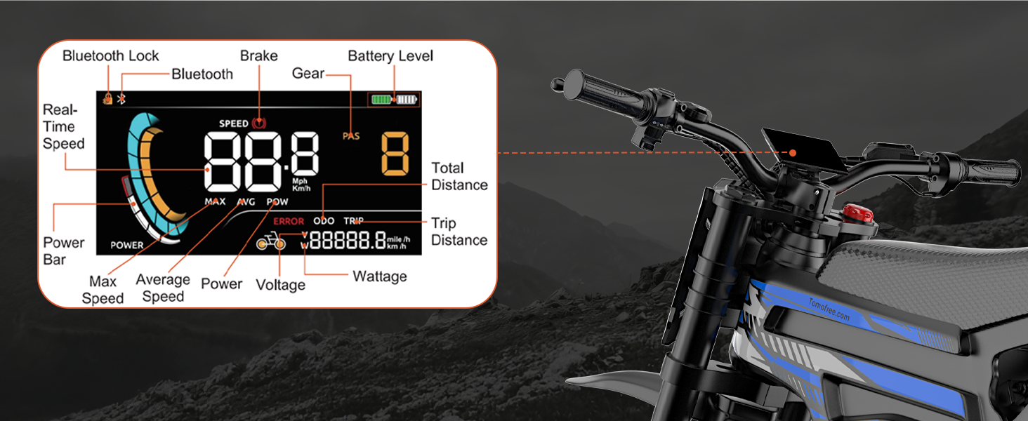 Bright LED display shows real-time speed, battery level, voltage, gear and riding status, while the full-twist throttle delivers smooth, instant and controllable power just like a professional motocross bike.